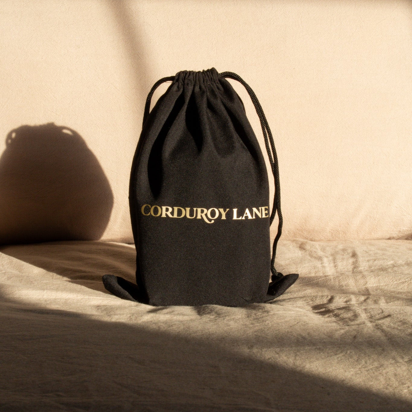 Black drawstring bag with 'Corduroy Lane' branding in gold lettering